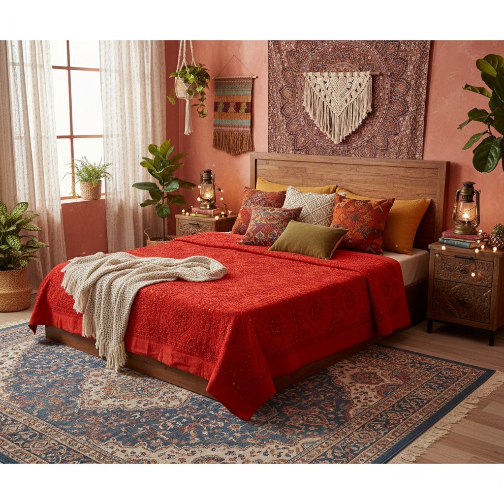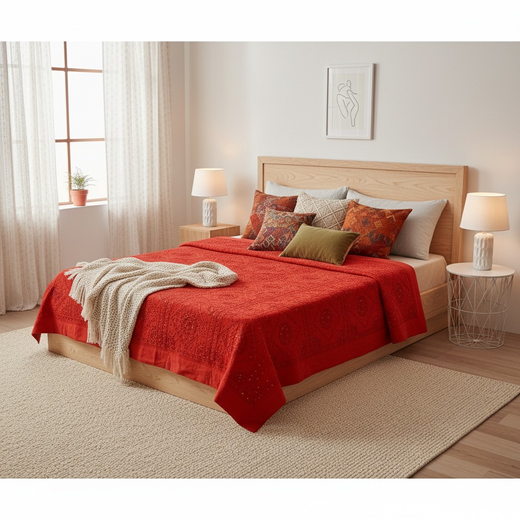 Cubre Cama de Algodón Roja con Espejitos – Elegancia Artesanal de la India