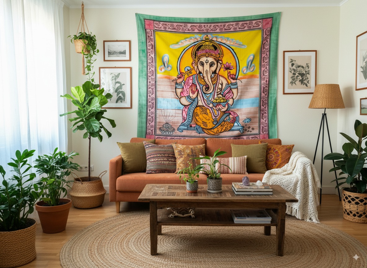 tapiz de algodon de Ganesh sobre sofa decoracion